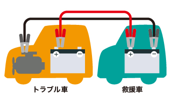 ブースターケーブルを使用して救援車のバッテリーから電気を分けてもらうことで、エンジンをスタートさせる方法です。