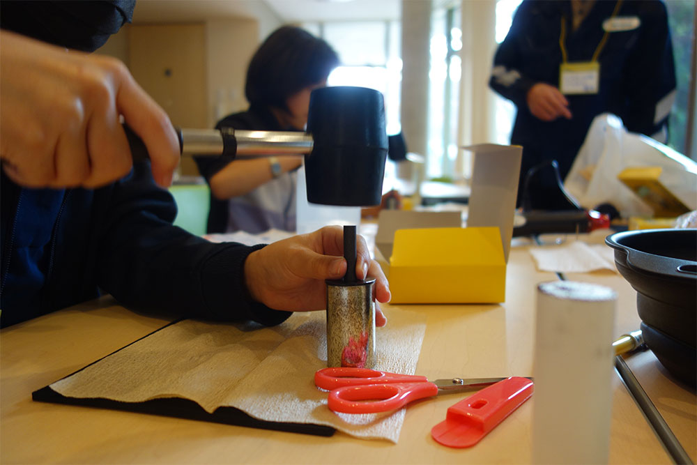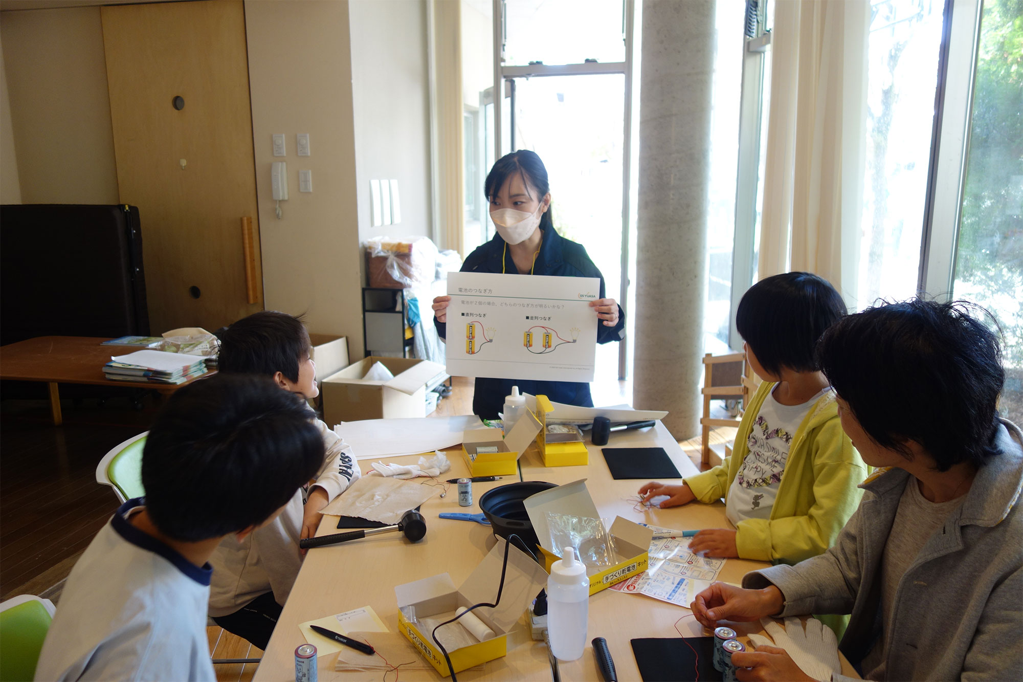 手作り電池教室では、電池とは何かや、電池にはどのような種類があるのかなどを学んだ後、電池工業会の手作り電池キットを用いてマンガン乾電池を作り、豆電球を灯す実験を行いました。